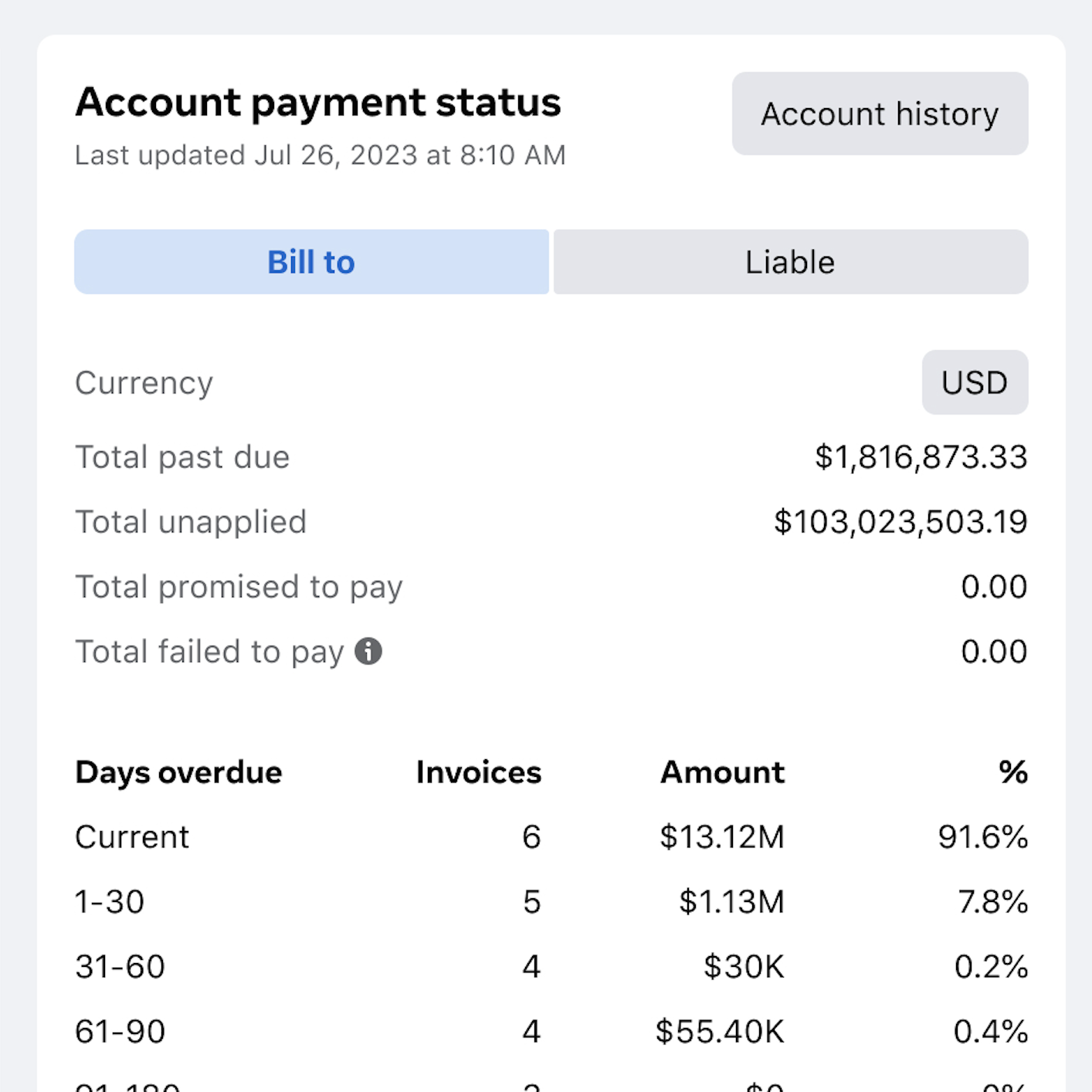 30 day revenue cycle: The existing tool was mainly used as a way to keep track of the revenue and credit cycle for Meta ad customers who used up their credits for ad spend. When their invoice is overdue after 30 days, it went into collections. Collection efforts: Our global agents struggled make collection attempts. There were many workflows and they had to keep following up with people internally and with customers. They had many other applications open to do their job.