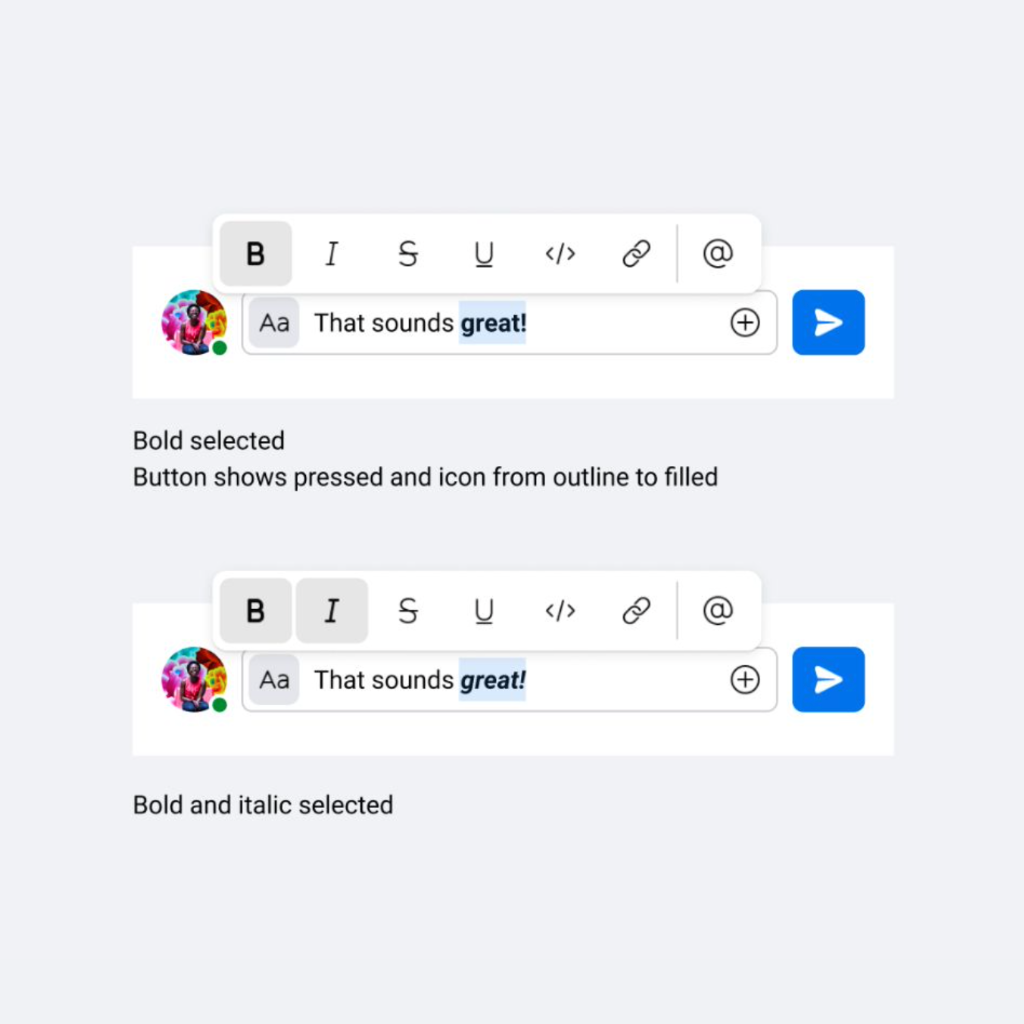 We are proposing to replace the “P” icon for Paragraph with “Aa” icon as the affordance for the text editor overflow menu. We also want to update the send button icon to what is standard for XDS.